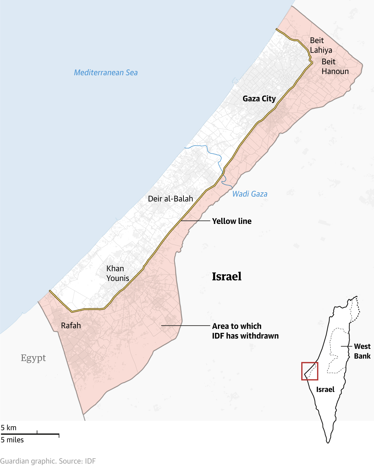 Ωστόσο, αυτό που γίνεται σαφές, σύμφωνα με τον Guardian, «είναι μια ολοένα και πιο έντονη διχοτόμηση της Γάζας, με το μεγαλύτερο μέρος του επιζώντος πληθυσμού των 2,1 εκατομμυρίων να είναι στριμωγμένο στο μισό έδαφος, ανάμεσα στα ερείπια που άφησαν πίσω τους δύο χρόνια ισραηλινών βομβαρδισμών».