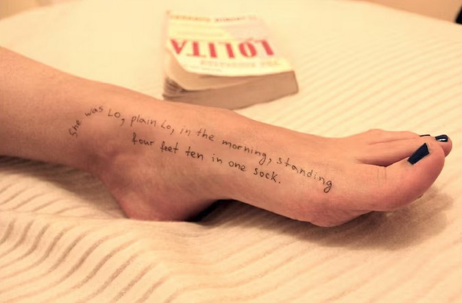 Άλλο υλικό περιλαμβάνει φωτογραφία γυναικείου ποδιού πάνω σε κρεβάτι, με φόντο αντίτυπο του μυθιστορήματος «Λολίτα» του Βλαντιμίρ Ναμπόκοφ, καθώς και απόσπασμα του βιβλίου γραμμένο στο πόδι.