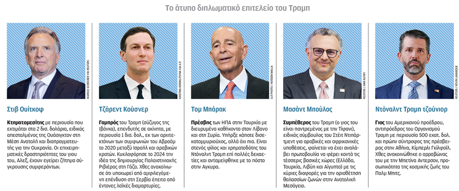 Οι άνθρωποι που διαδραματίζουν ρόλο στην προσέγγιση «Τραμπ 2.0» είναι άτομα όπως ο καριερίστας στο real estate Στιβ Γουίτκοφ και ο επενδυτής και γαμπρός του προέδρου, Τζάρεντ Κούσνερ. «Οι περισσότερες αποφάσεις απλώς υποβάλλονται πλέον από τον ίδιο τον Τραμπ σε λίγα πρόσωπα που εμπιστεύεται», δήλωσε στους F.T. η πρώην εκπρόσωπος Τύπου του Λευκού Οίκου, Αννα Κέλι.