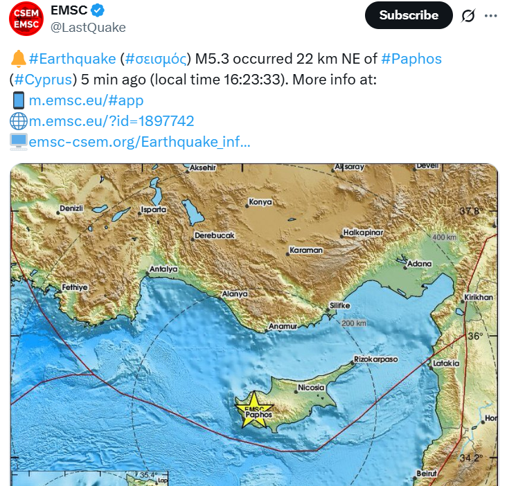 Νέα σεισμική δόνηση σημειώθηκε πριν από λίγη ώρα στην Κύπρο. Η σεισμική δόνηση έγινε αισθητή λίγο μετά τις 16:23 σε όλες τις επαρχίες της Κύπρου, ενώ είχε ξάνα επικέντρο την Πάφο.