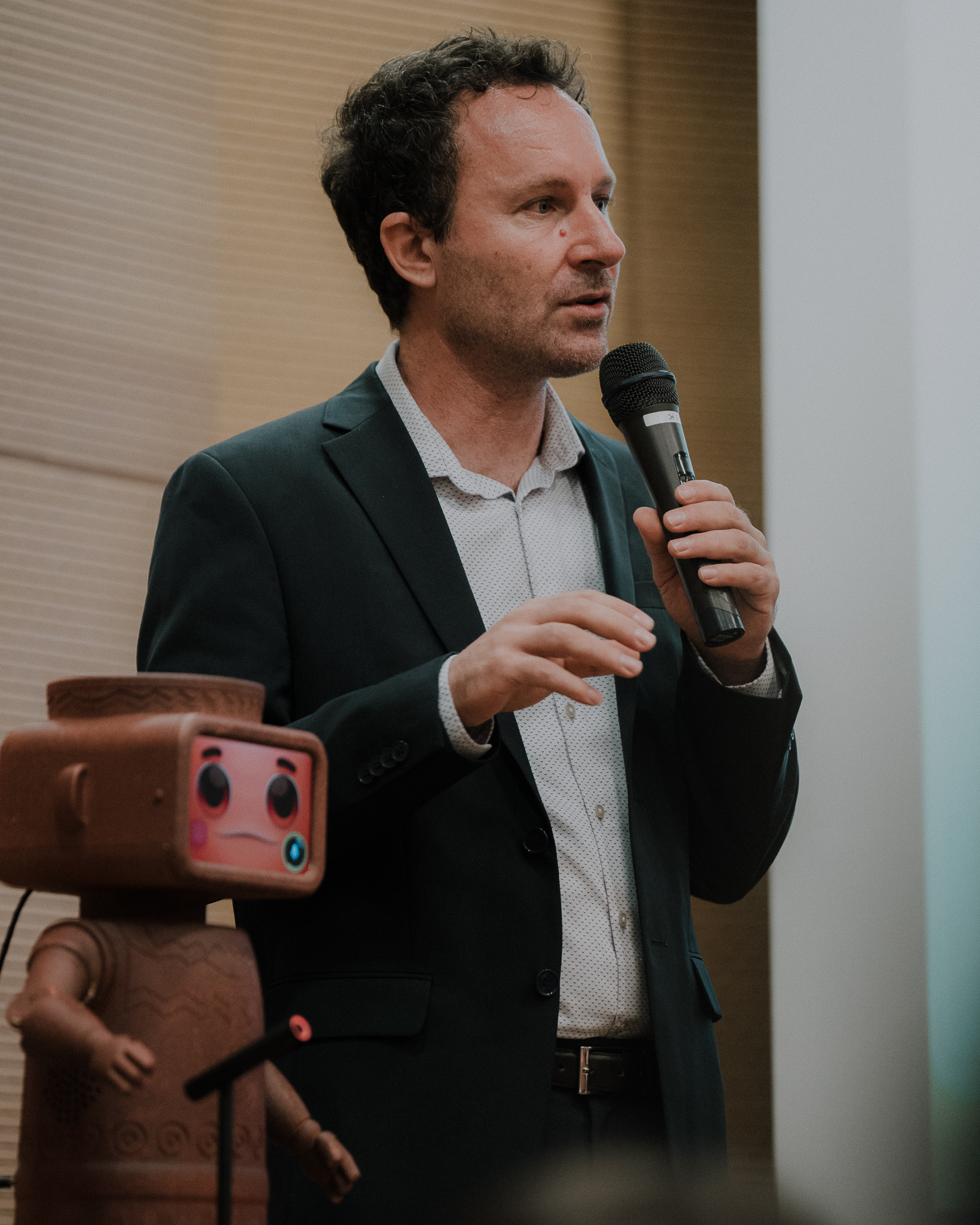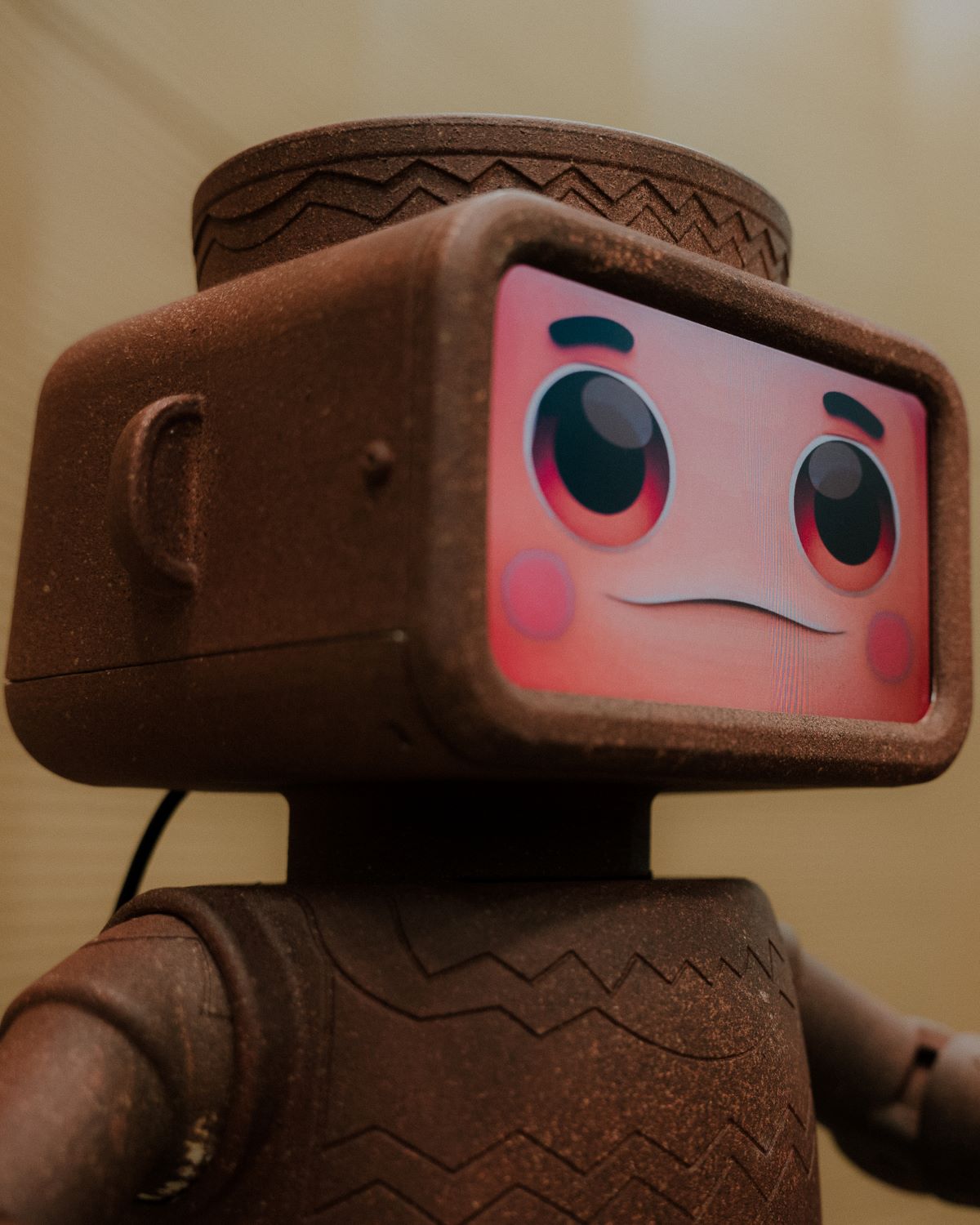 Απάντηση: Ο σχεδιασμός του είναι εμπνευσμένος από τον υλικό πολιτισμό της κυπριακής αρχαιότητας. Τα ερυθροκαστανά χρώματα και τα γεωμετρικά μοτίβα στο σώμα του παραπέμπουν στην ιστορία μας, γεφυρώνοντας το παρελθόν με το μέλλον. Η οθόνη στο κεφάλι του, που προβάλλει ανθρώπινες εκφράσεις όπως χαμόγελο ή περιέργεια, επιτρέπει μια φυσική και άμεση αλληλεπίδραση με τους επισκέπτες/πτριες, δίνοντάς του μια «συναισθηματική» διάσταση.